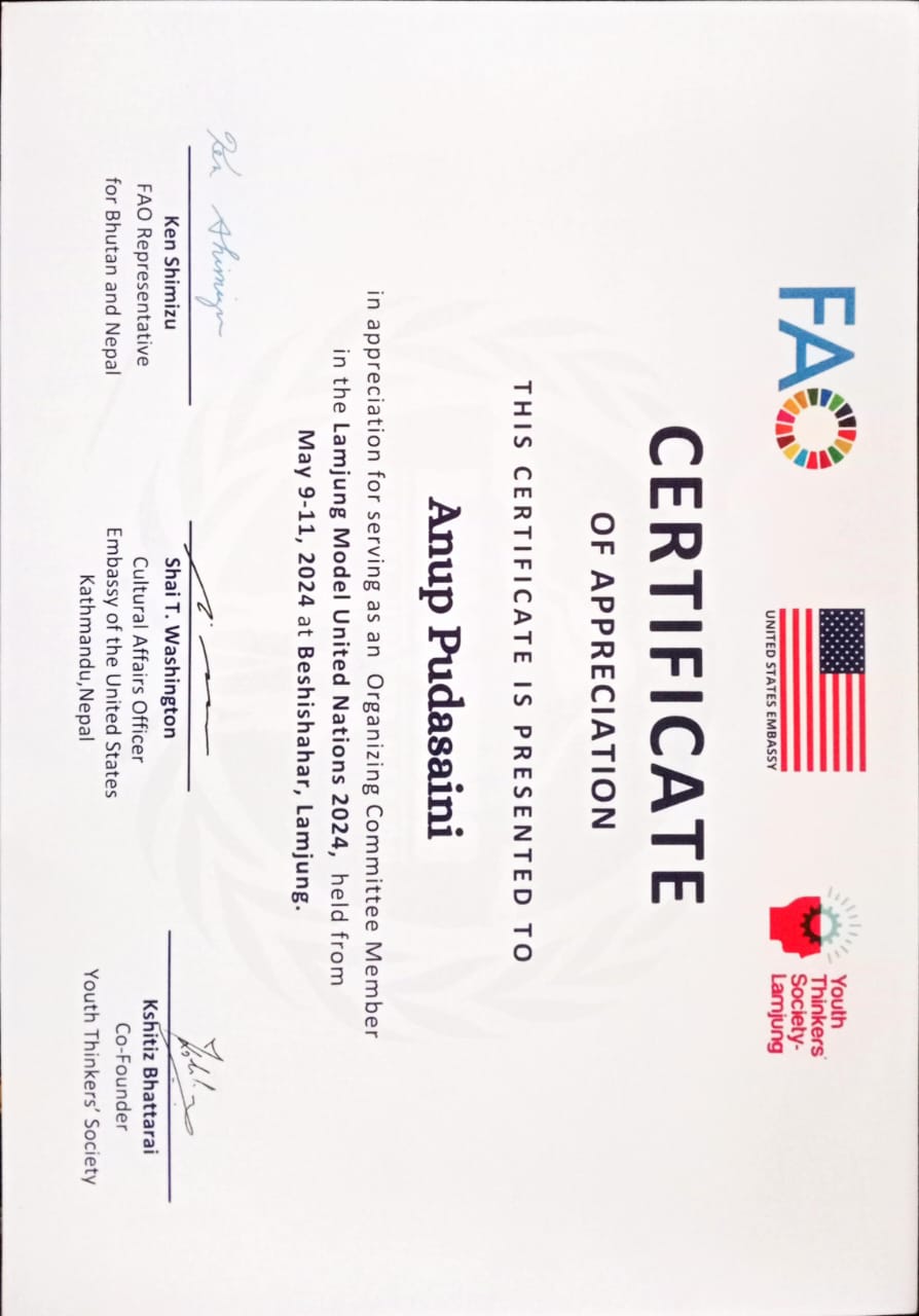 - Partnered with FAO Nepal and the US Embassy for Model UN programs.