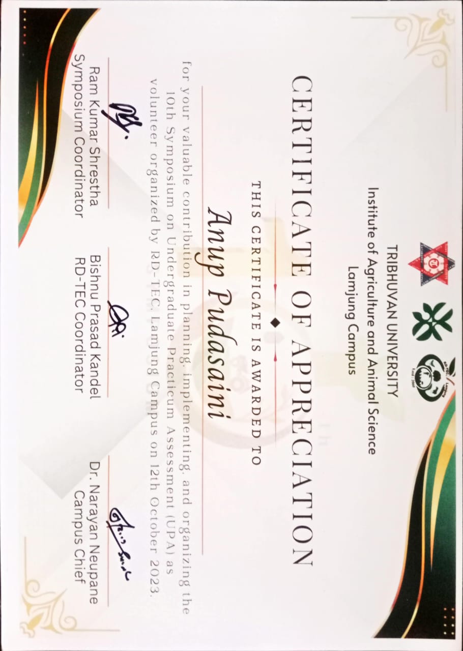 Motivated and impact-driven agriculture graduate from Tribhuvan University with hands-on experience in agricultural research, GIS mapping, and youth leadership. I have led multiple community-oriented projects integrating sustainable farming practices, digital tools, and youth engagement. My passion lies in bridging research, technology, and community development to create practical solutions for Nepal's agricultural challenges.